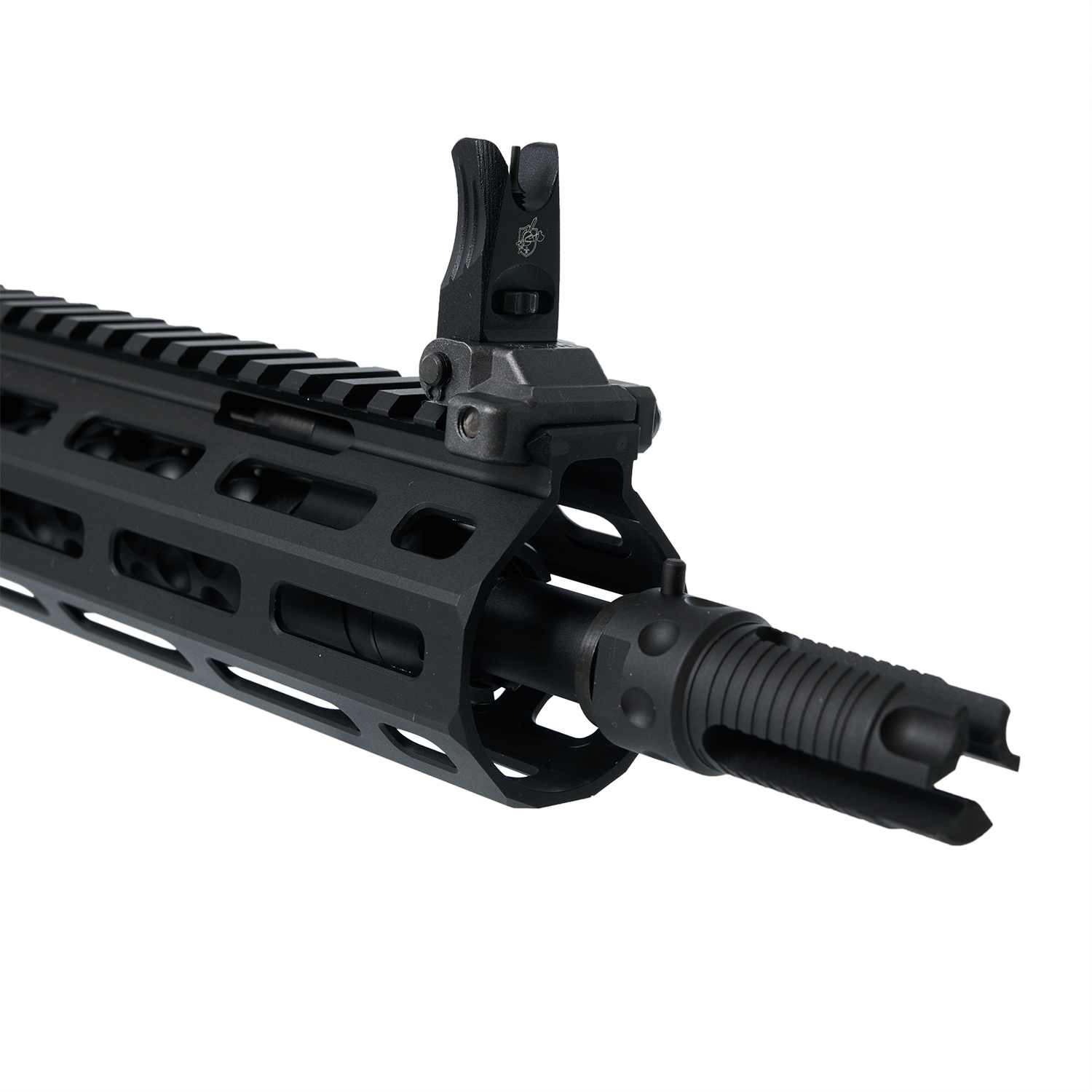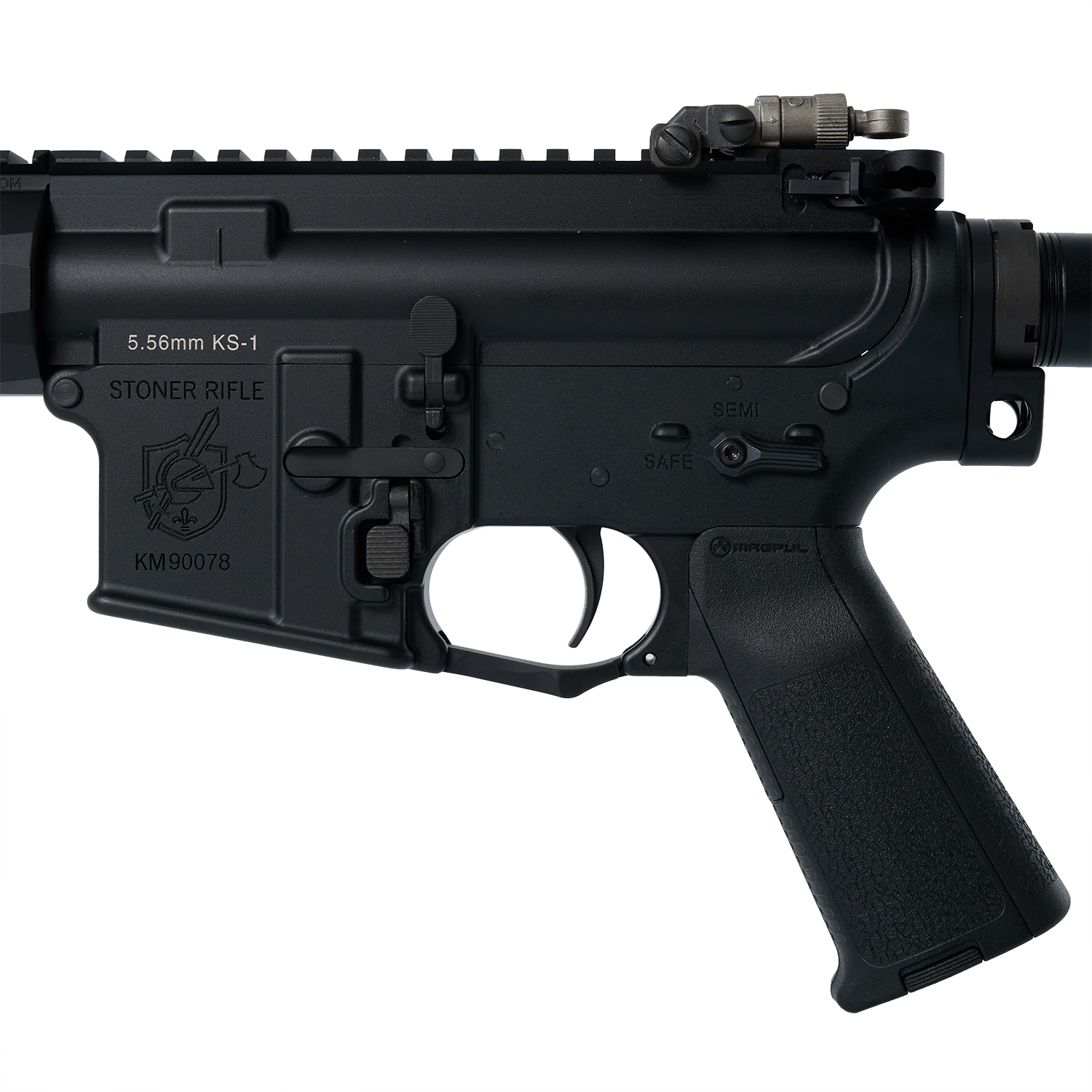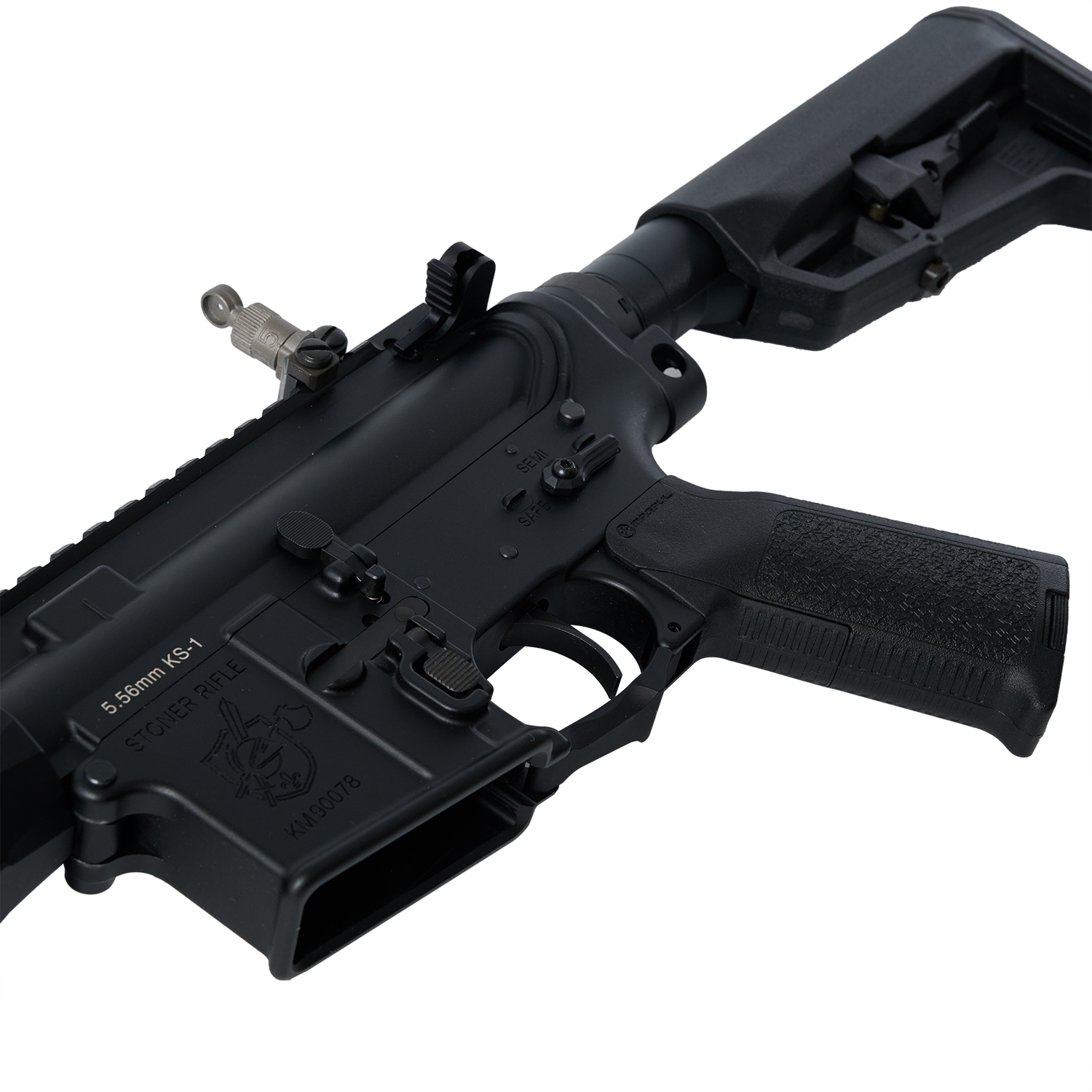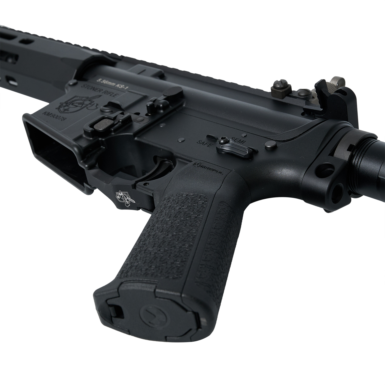 アンビ仕様のDYTAC製SR16E3レシーバーをベースとしているため完璧な再現とはいきませんが、ANGRY GUN製高品質アウターパーツをメインにKS-1セットアップにかなり近い形に仕上げました。アッパーには「5.56mm KS-1」マーキングを刻印しています。