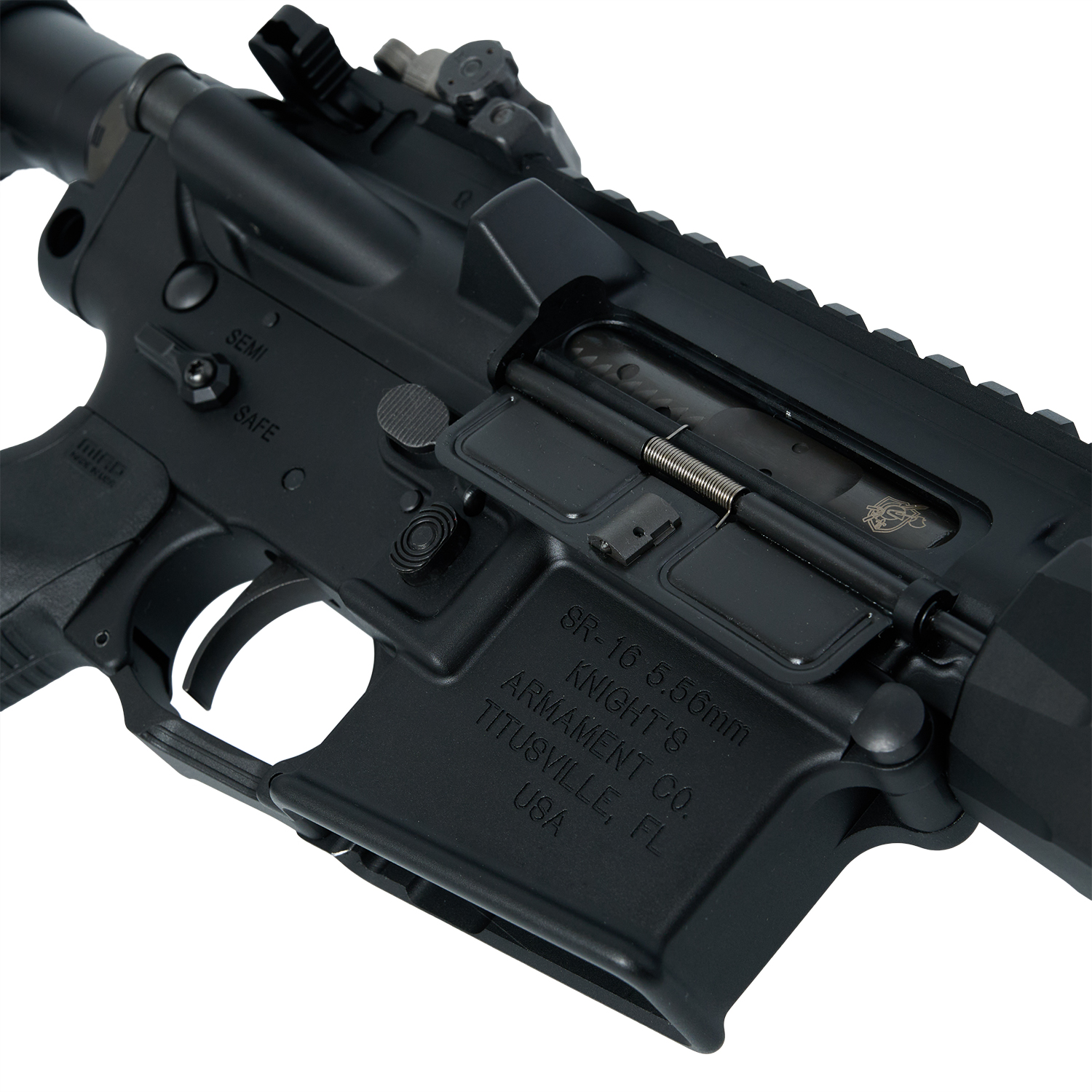 エジェクションポートから覗くのは、KAC刻印入りのORGAスチールボルトキャリア。FRAノズルを組込んでおりますので、フィールドレギュレーションや気温に合わせたパワー・ブローバック調整が行えます。
