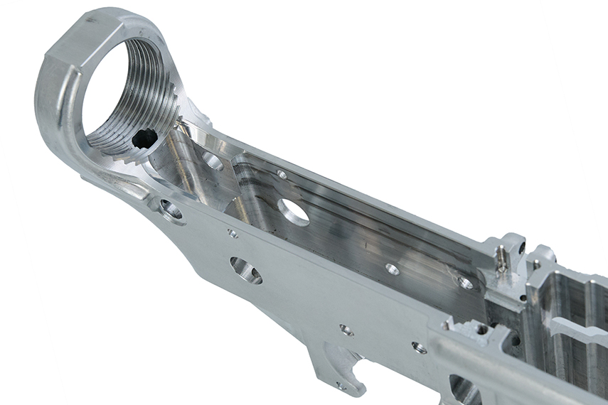 また80%レシーバーには、ファイアコントロールユニットのスペースやピン類の穴開け位置を特定する印を付けていないという条件もあります。CNCで切削する前の80%レシーバーは以下のようなイメージとなります。