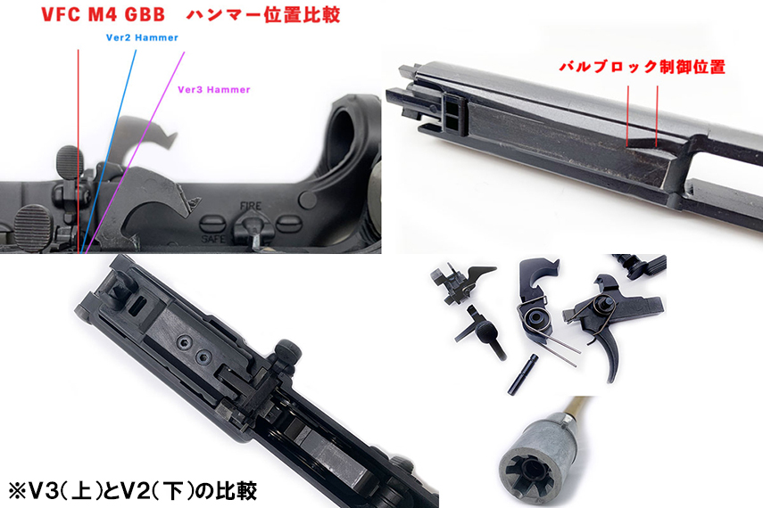 具体的には、V3とV2以前にはファイヤリングピンブロックとハンマーに設計差があるため、ガスカット機構を備えたV2以前のファイヤリングピンブロックは本製品に適合しません。ご注意ください。