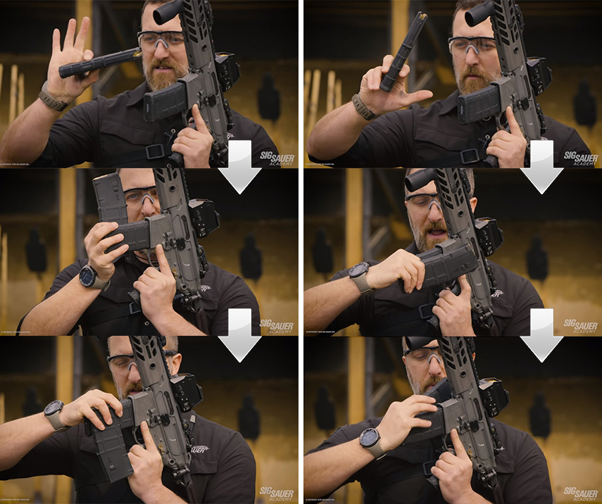 片手で同時に2本のマガジンを扱うので慣れが必要ですが、いくつかある手法の1例をご紹介しましょう。