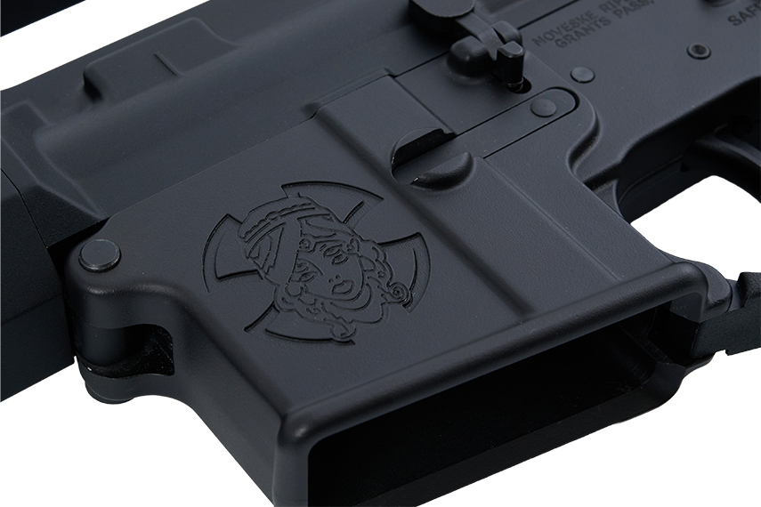 刻印はCHAINSAWシリーズ登場初期のIRON Xのみのマーキングを再現。サイズ的にはCQBRとなるため取り回しとアクセサリー搭載量のバランスが良く、あらゆるフィールドで使いやすいオールマイティーな1挺となっています。