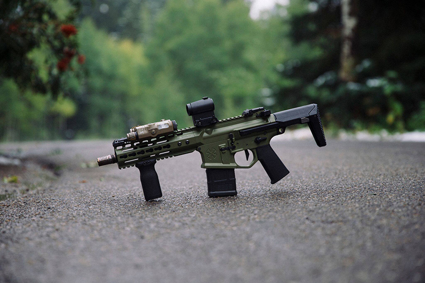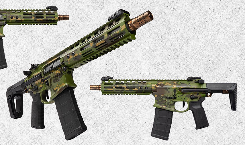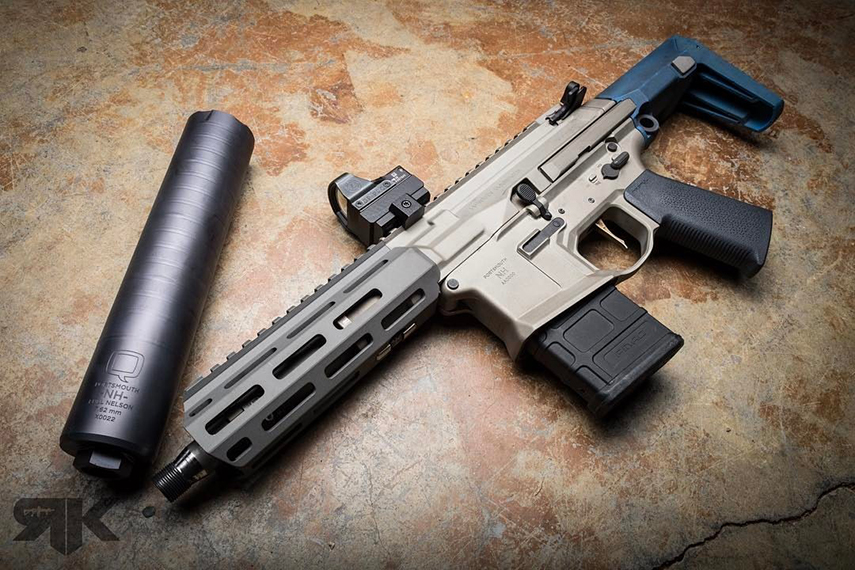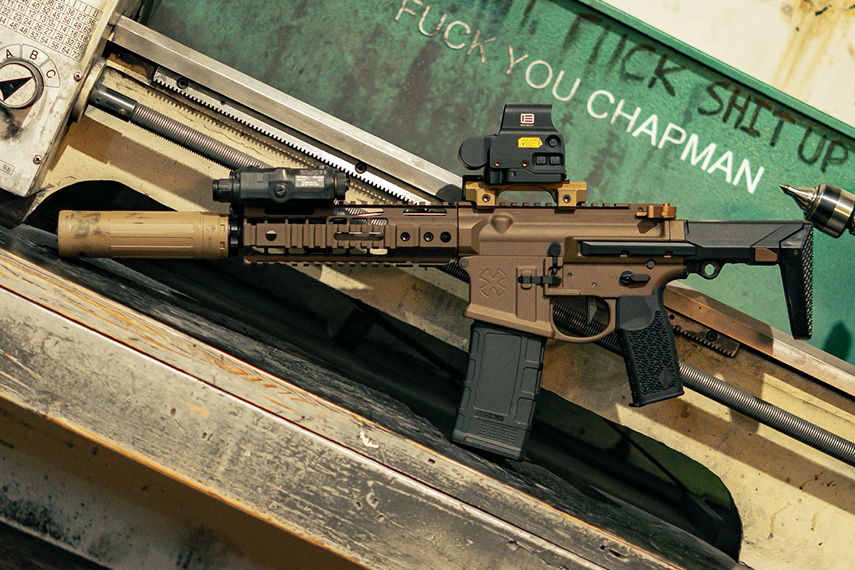 かつてNOVESKEの代名詞的なハンドガードだったSWS(Superior Weapons Systems)クアッドレールを装着し、Backdoor Brownなるカスタムセラコートで染められた限定モデル。
