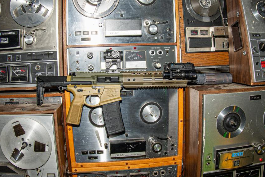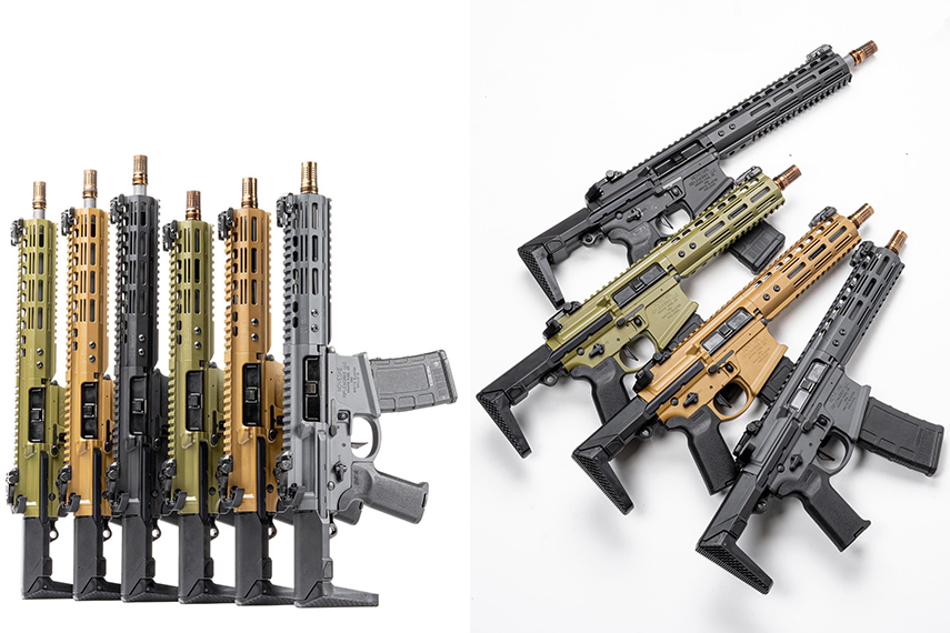 1つは10.5インチでハンドガード、アッパー、ロアを3色で塗り分けた5.56mm仕様。2つ目は12.5インチにクアッドレールを組み合わせ、GROUN TOWNというカスタムセラコートの5.56mm仕様。3つ目はNHRをNSRハンドガードに置き換えた.300BLK仕様。BAZOOKA GREENではなくOD GREENで仕上げているところが渋い!