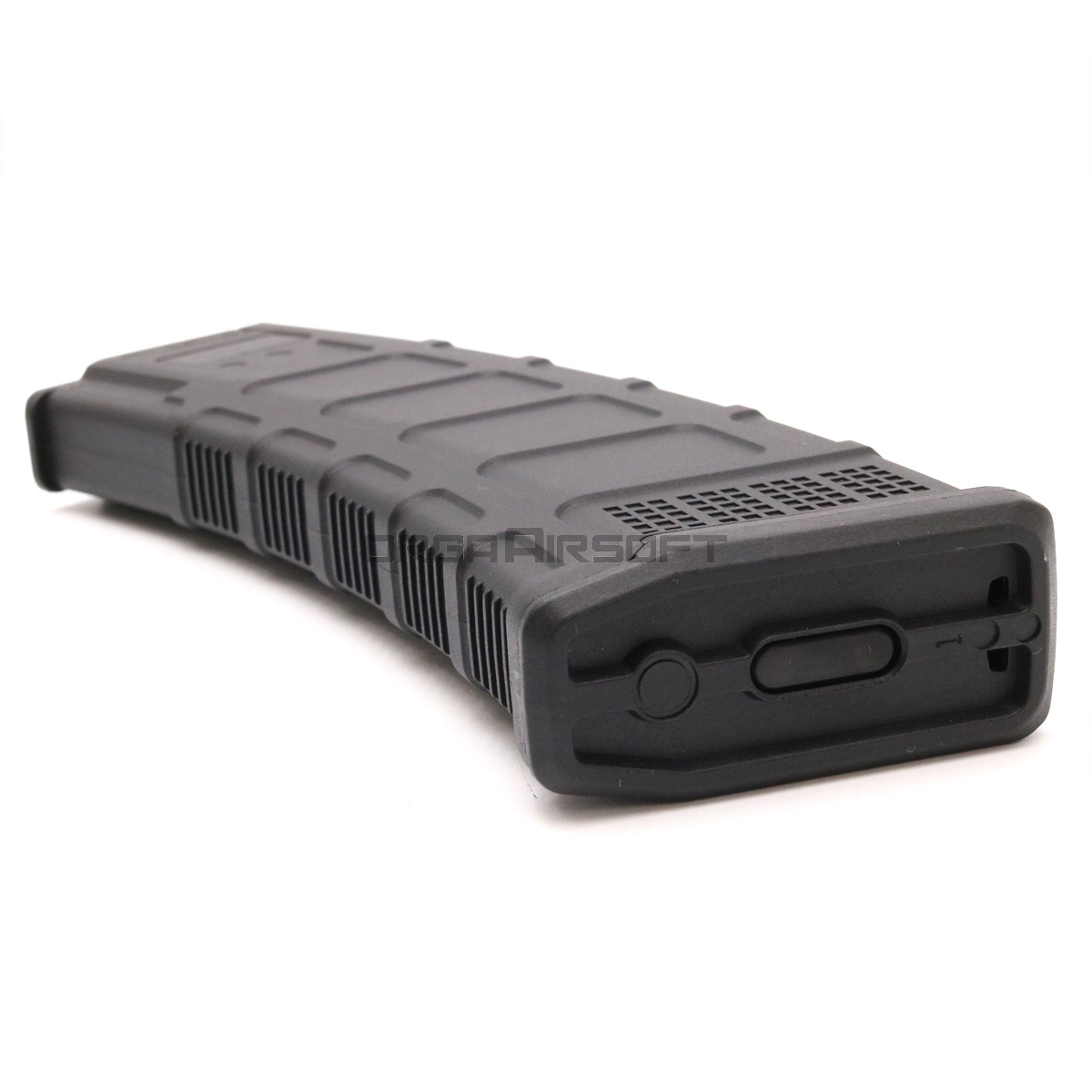 スタンダードAK74電動ガン用PMAG MOEタイプの135連マガジンです。底部のプレートをスライドさせて外し、アウターケースから本体内部を下に引き抜くと装弾数の切り替えスイッチにアクセスできます。スイッチを30マーキング方向に操作することにより30連マガジンとなり、リアルカウントのゲームもお楽しみいただけるようになります。