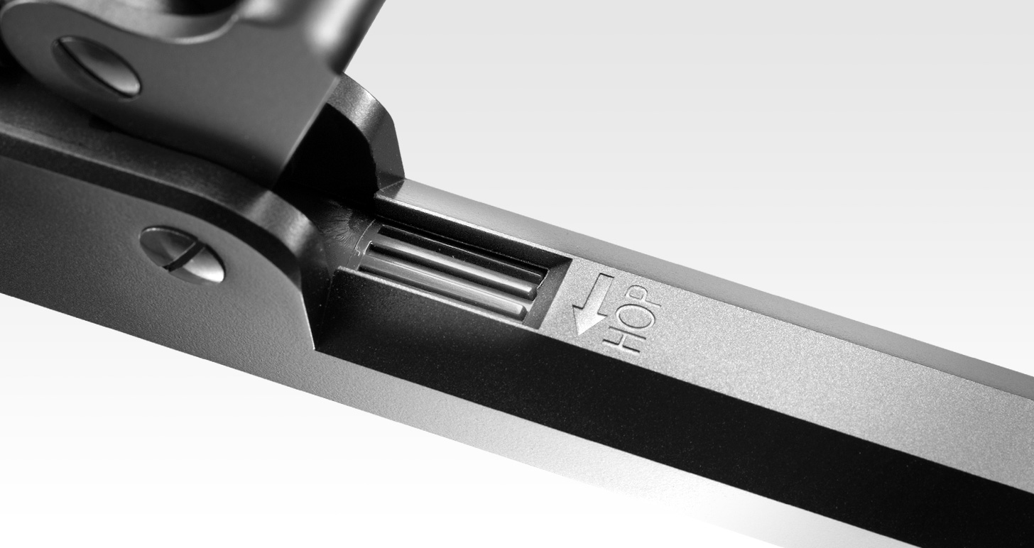 可変ホップアップシステム搭載:弾に回転をあたえることで、少ないパワーで遠くまでBB弾を飛ばすことができる可変ホップアップシステムを搭載。0.12gまたは0.2gのBB弾に合わせて、ホップのかかり具合が調整可能です。