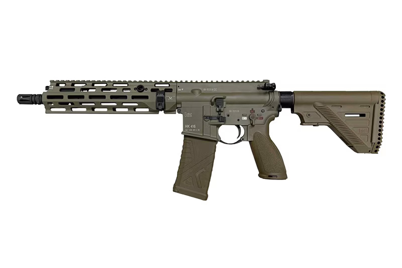 HK416A5は、ドイツのHeckler & Koch社が開発したHK416シリーズの改良型アサルトライフルで、5.56×45mm NATO弾を使用し、ショートストロークガスピストン方式を採用しています。高い信頼性と整備性を備え、過酷な環境でも安定した作動性能を誇ります。A5モデルでは、サプレッサー運用に対応したツール不要の2段階式ガスレギュレーター、アンビ仕様セレクター、操作性を高めた大型チャージングハンドル、高耐久の冷間鍛造バレルなどが特徴です。