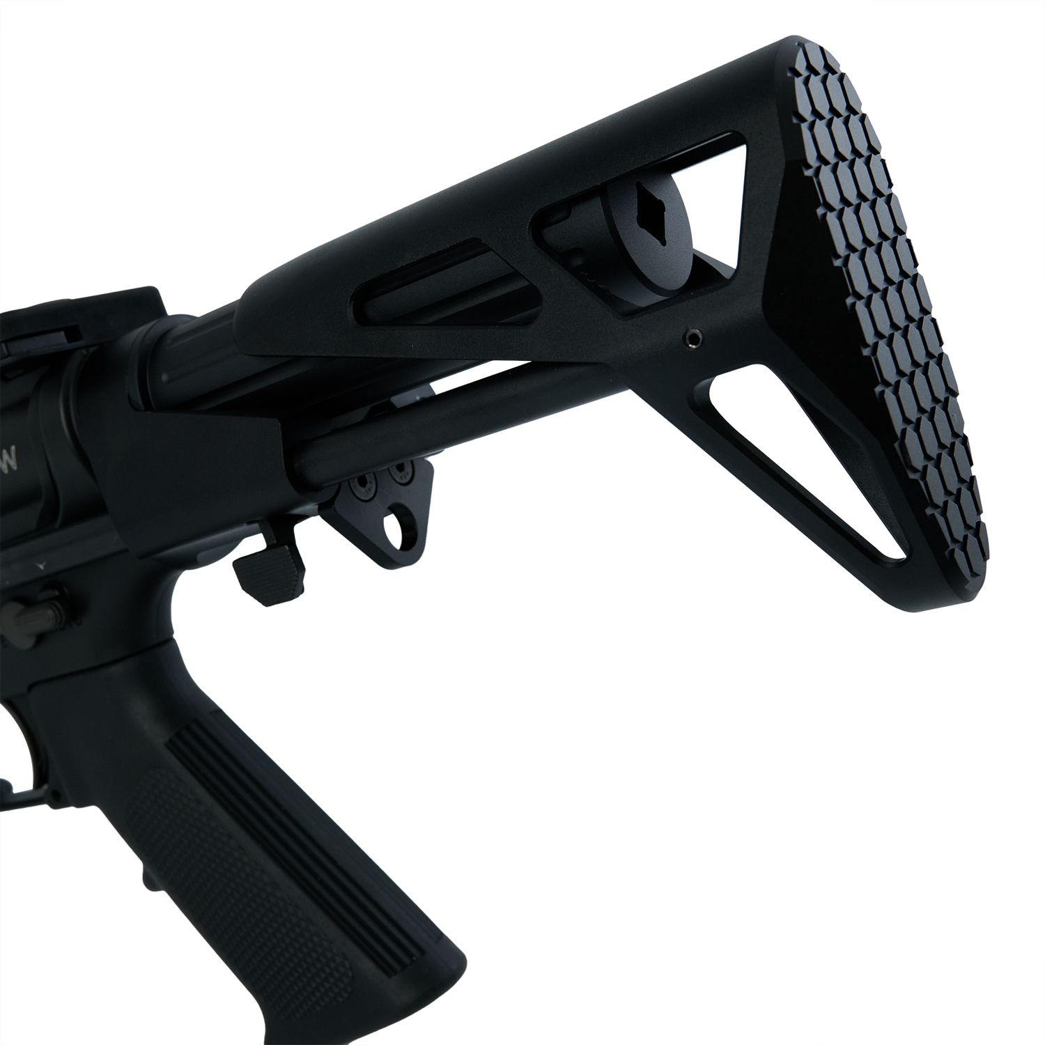 7インチのショートバレルにMAXIM CQBタイプのワイヤーストックを備え、全長を短く抑えたPDW(Personal Defense Weapon)スタイルのガスブロです。刻印やディテールなど可能な限り実銃に近づけ、そのクオリティはさすがオフィシャルライセンス品といったところ。グリップやセレクターなど一部M4パーツの流用もありますが、ハンドガードやレシーバーなど替えの効かないパーツは徹底的に実銃デザインをトレースした拘りが見えます。