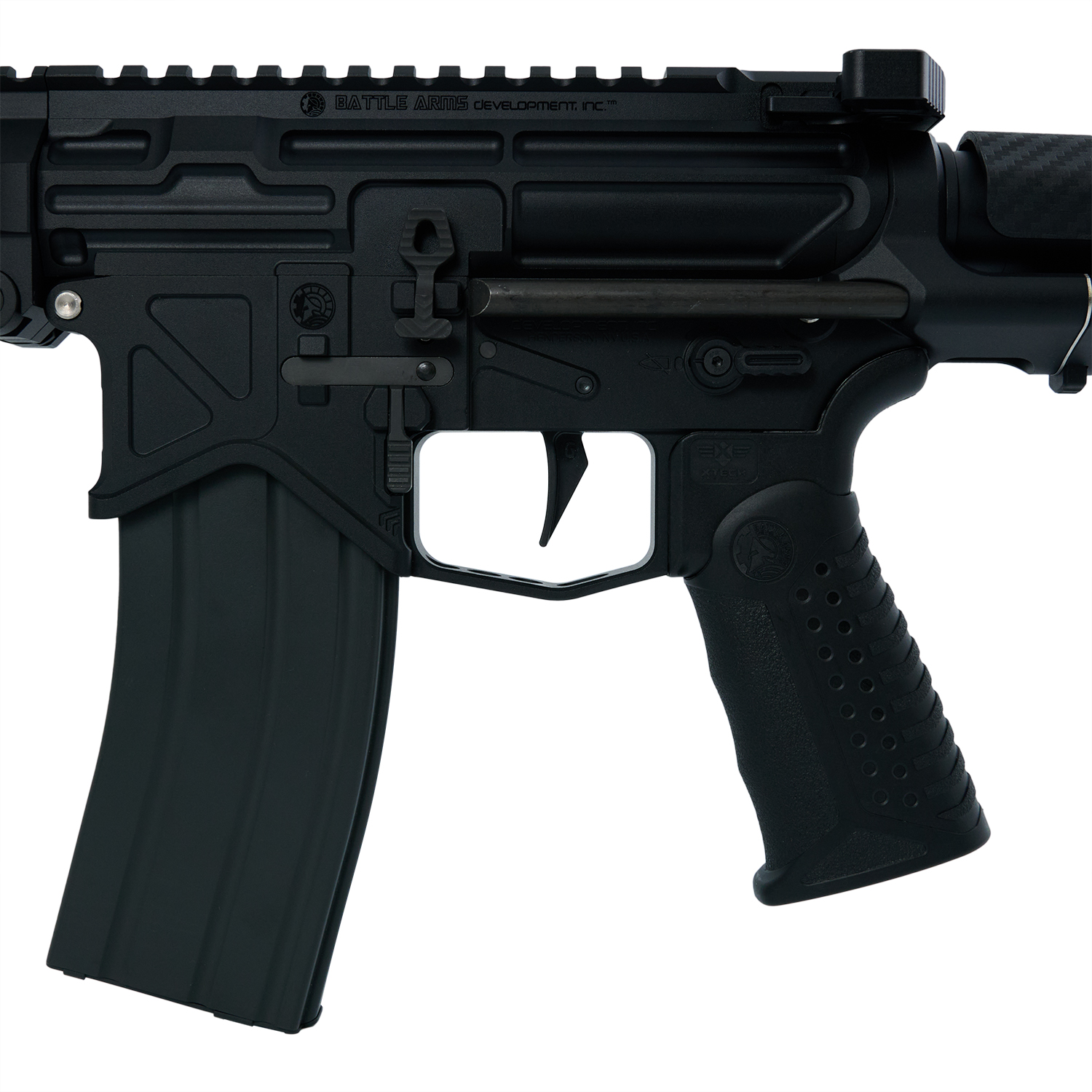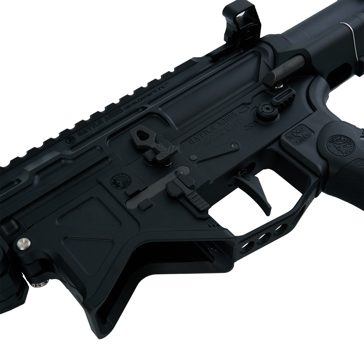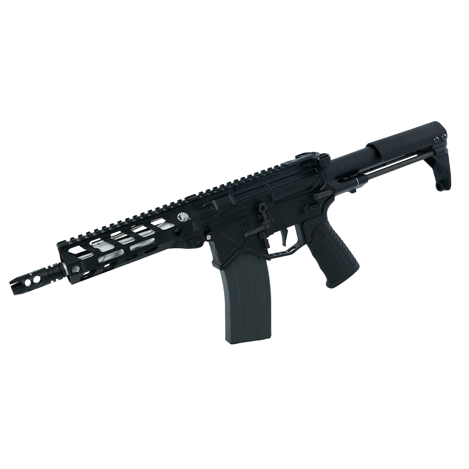 フルート加工やBATTLE ARMS(バトルアームズ)ロゴが特長の軽量7.5インチのアウターバレルに FORTIS×BAD Switch556 M-LOK 6.7インチハンドガードを組み合わせ、カービンアッパーとPDWロアの組み合わせが独特の雰囲気を演出。