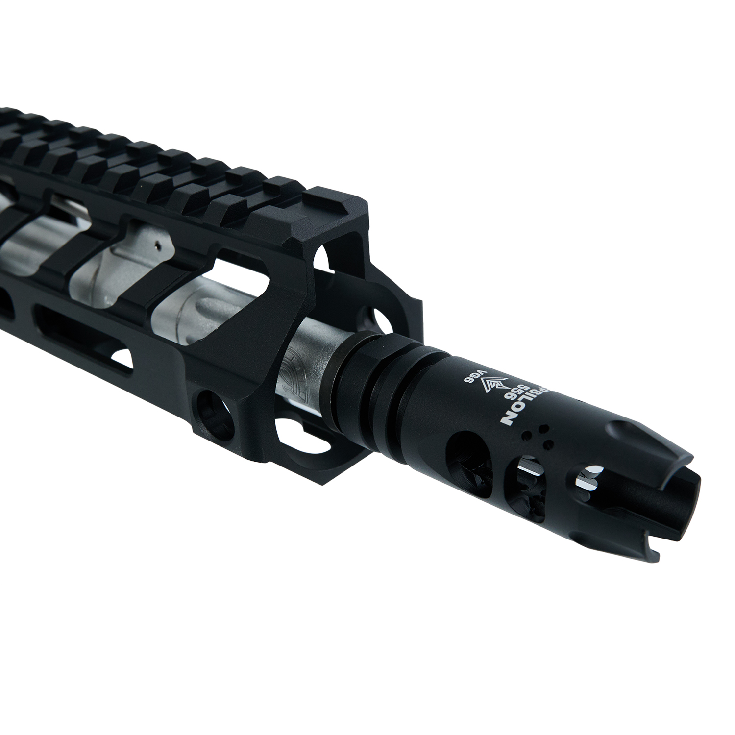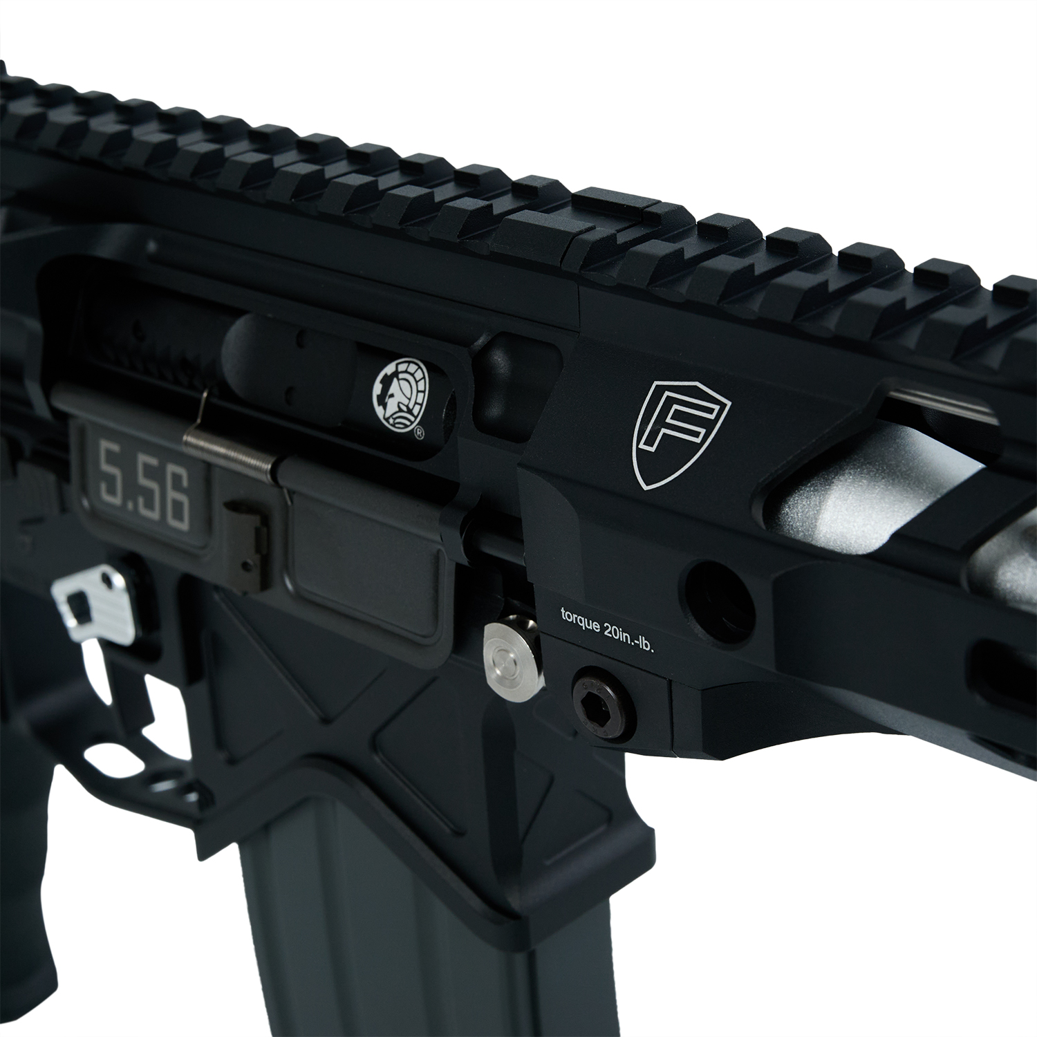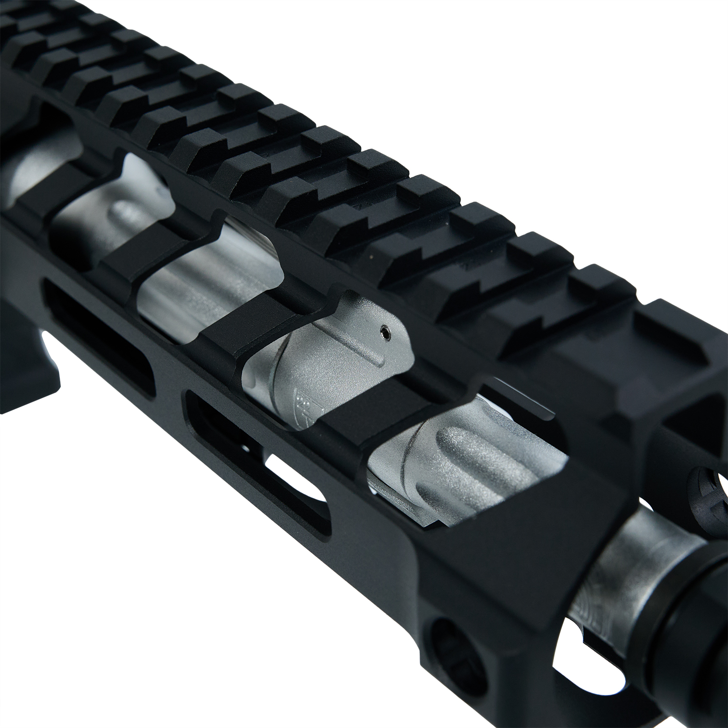 フルート加工やBATTLE ARMS(バトルアームズ)ロゴが特長の軽量7.5インチのアウターバレルに FORTIS×BAD Switch556 M-LOK 6.7インチハンドガードを組み合わせ、カービンアッパーとPDWロアの組み合わせが独特の雰囲気を演出。