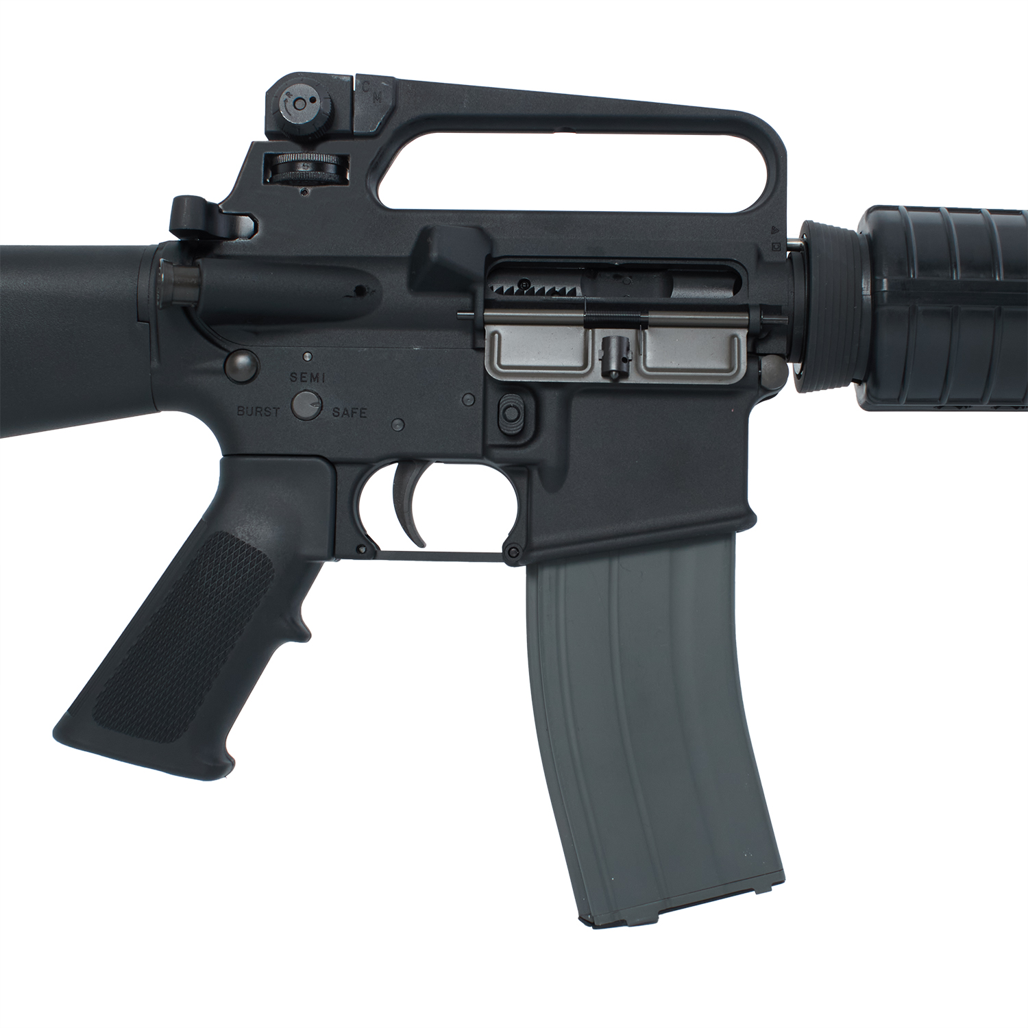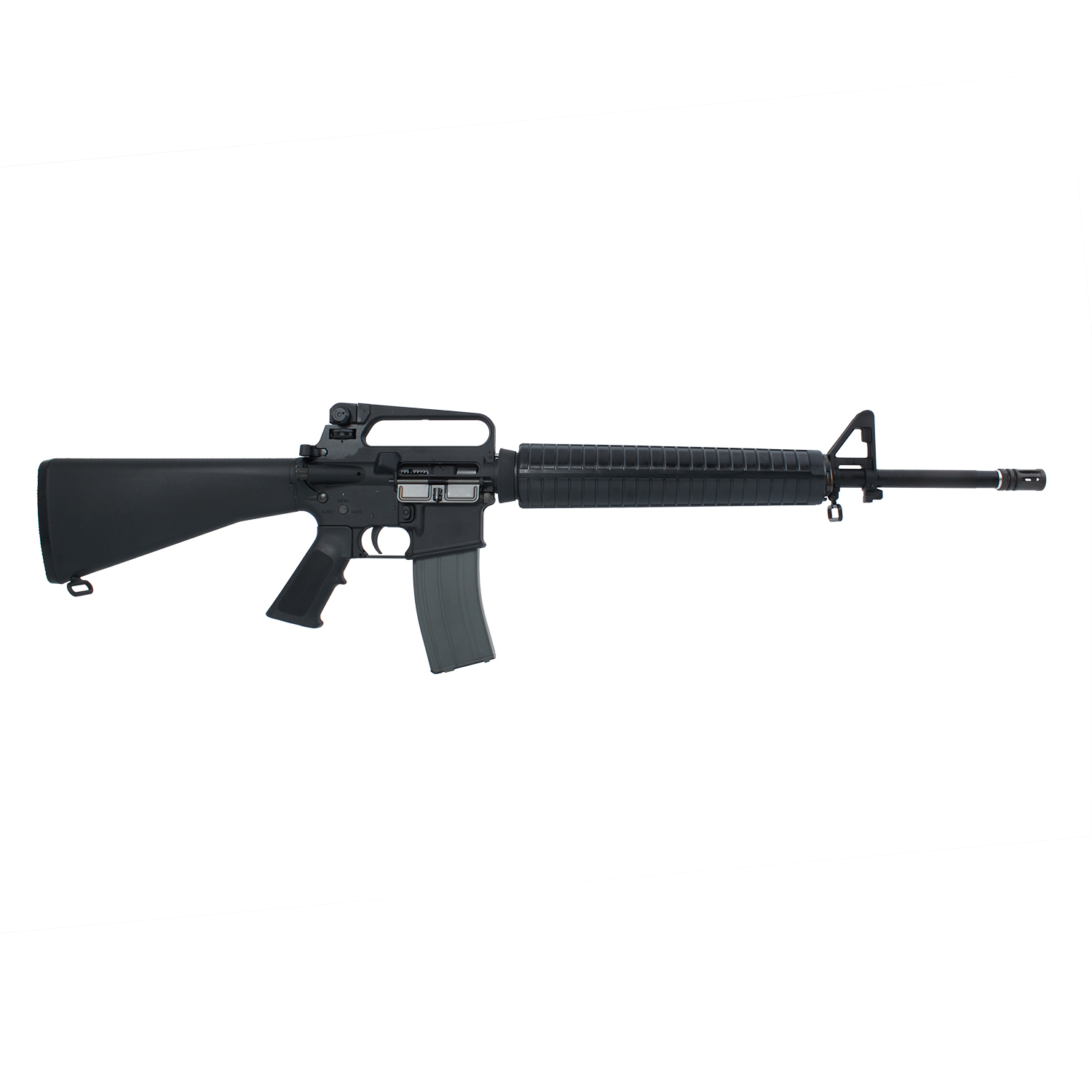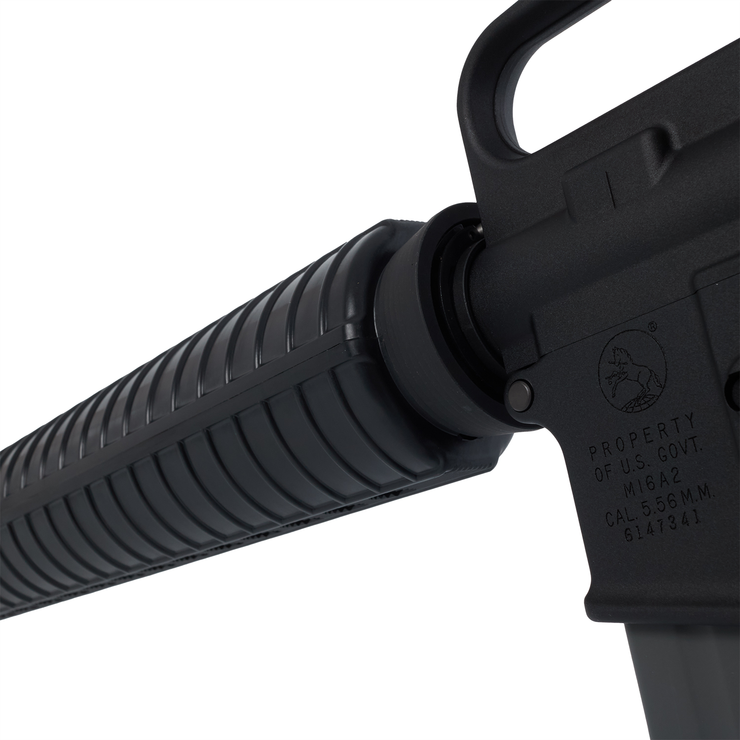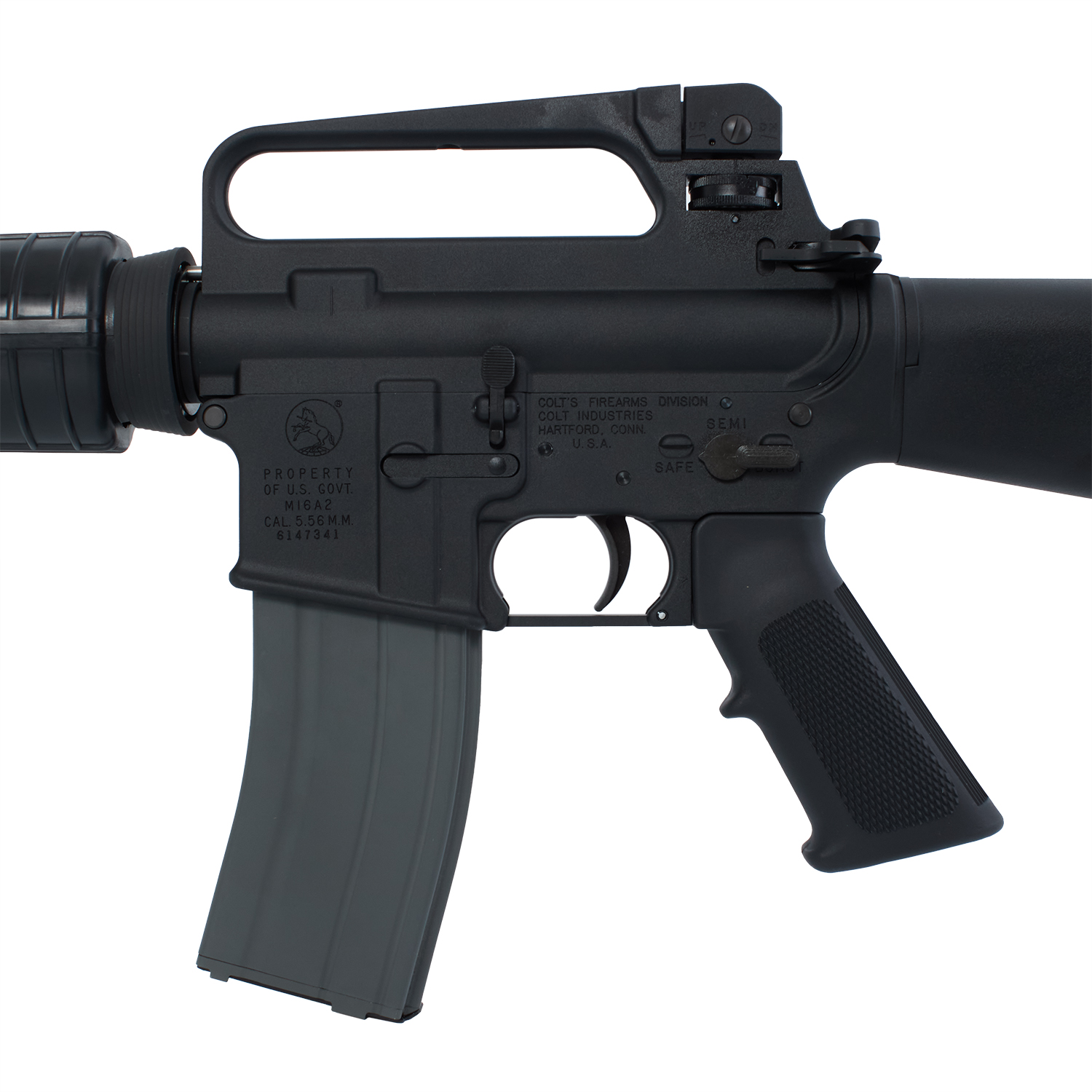 M16A2は、M16A1アサルトライフルをベースに1980年頃、新弾薬であるSS109に最適化されたブルバレルと円筒型ハンドガード。フルオートの代わりにメカニカル3点バースト機構を備え、後のM4A1カービンの誕生までアメリカ軍の正式アサルトライフルとして採用されました。